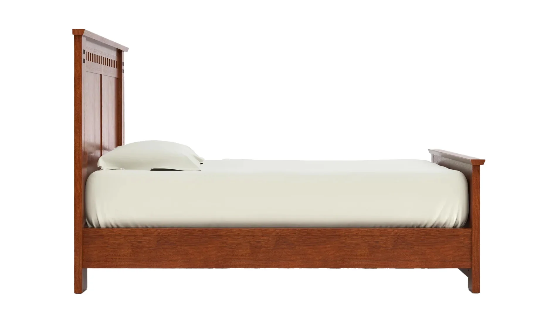 This exquisite bed, handcrafted from solid wood, embodies Stickley's legacy of enduring quality and timeless design. The Highlands collection draws inspiration from the Arts & Crafts movement, evident in its clean lines, overhanging prairie cap rails, and intricate laser-etched motif. Pierced squares on the headboard add a touch of visual interest, while the sturdy construction ensures lasting durability for generations to come. This bed is not just a place to sleep; it's a statement piece that elevates any bedroom with its understated elegance and enduring charm.