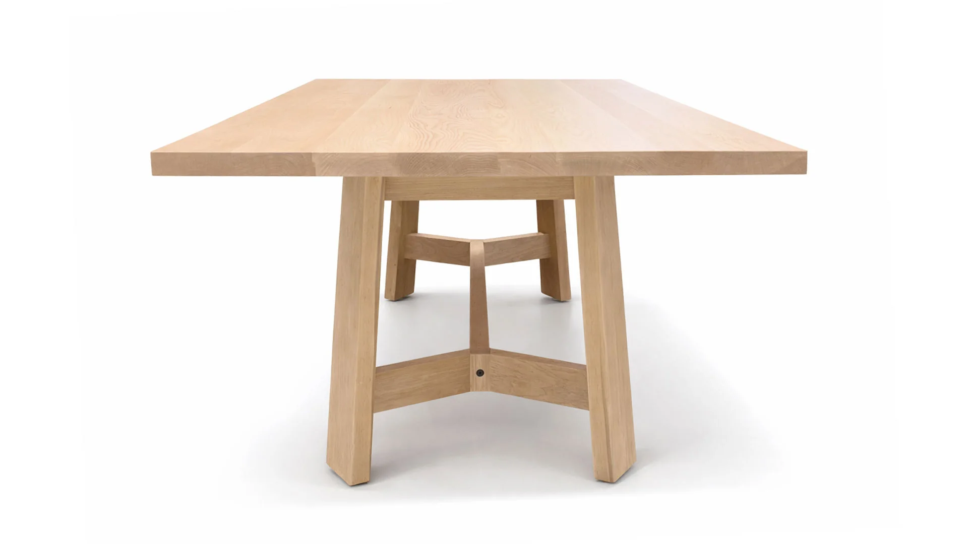 The table is built entirely from solid maple, showcasing a light, natural finish that highlights the wood’s tight grain and subtle color variation. A thick rectangular top with ever so slightly eased edges conveys durability and permanence, while remaining visually clean and understated. The surface is expansive and unadorned, allowing the natural beauty of the maple to take center stage. The base features a classic trestle construction: two substantial, slightly splayed legs at each end connected by a full-length stretcher. The joinery is straightforward and purposeful, consistent with Amish building traditions that favor strength, longevity, and repairability over decorative excess.